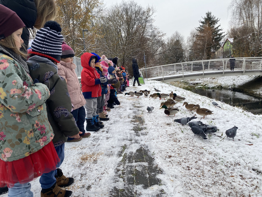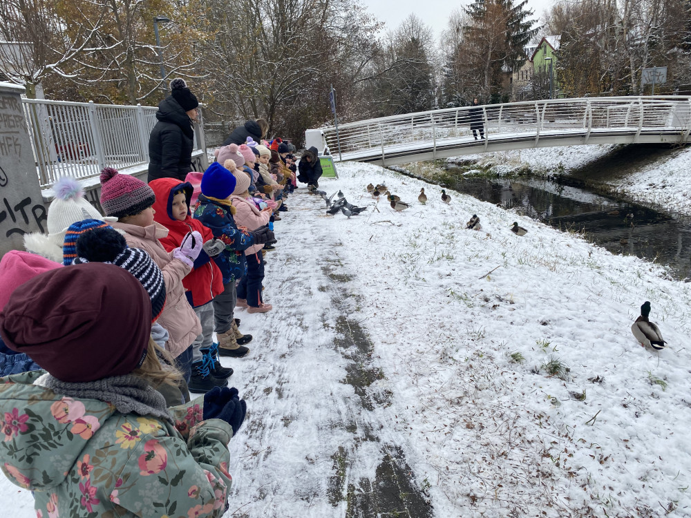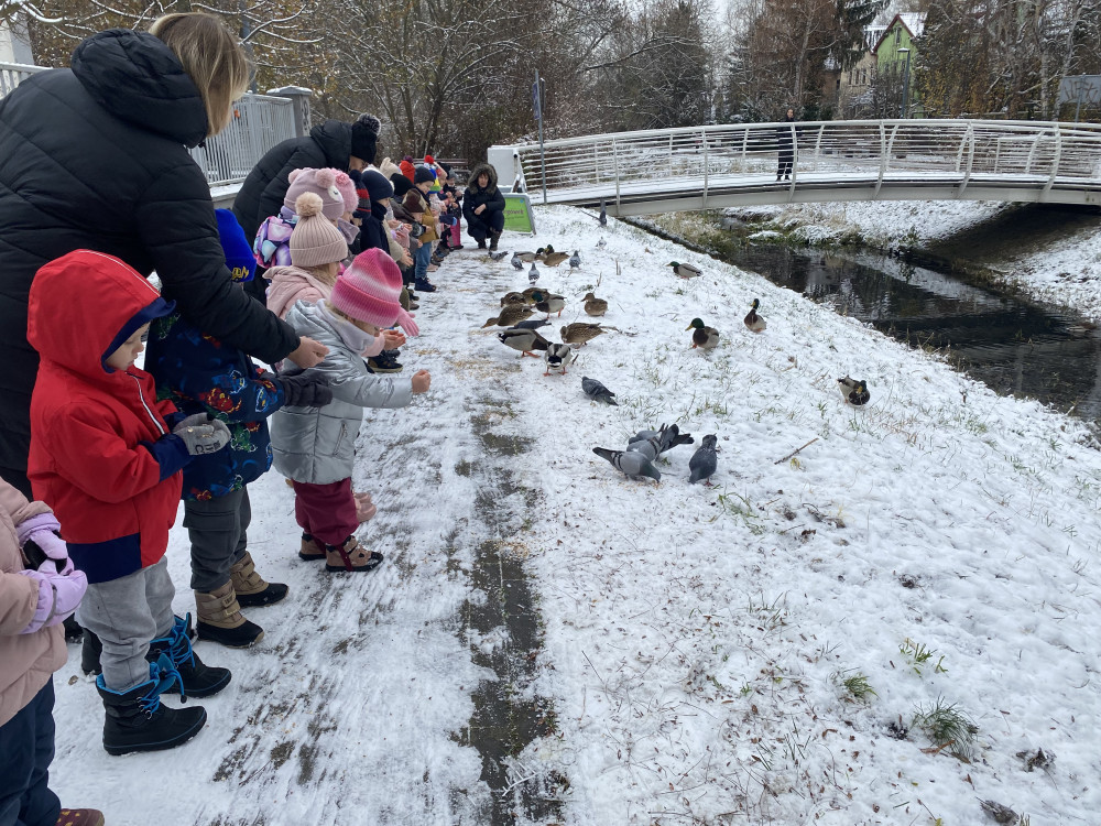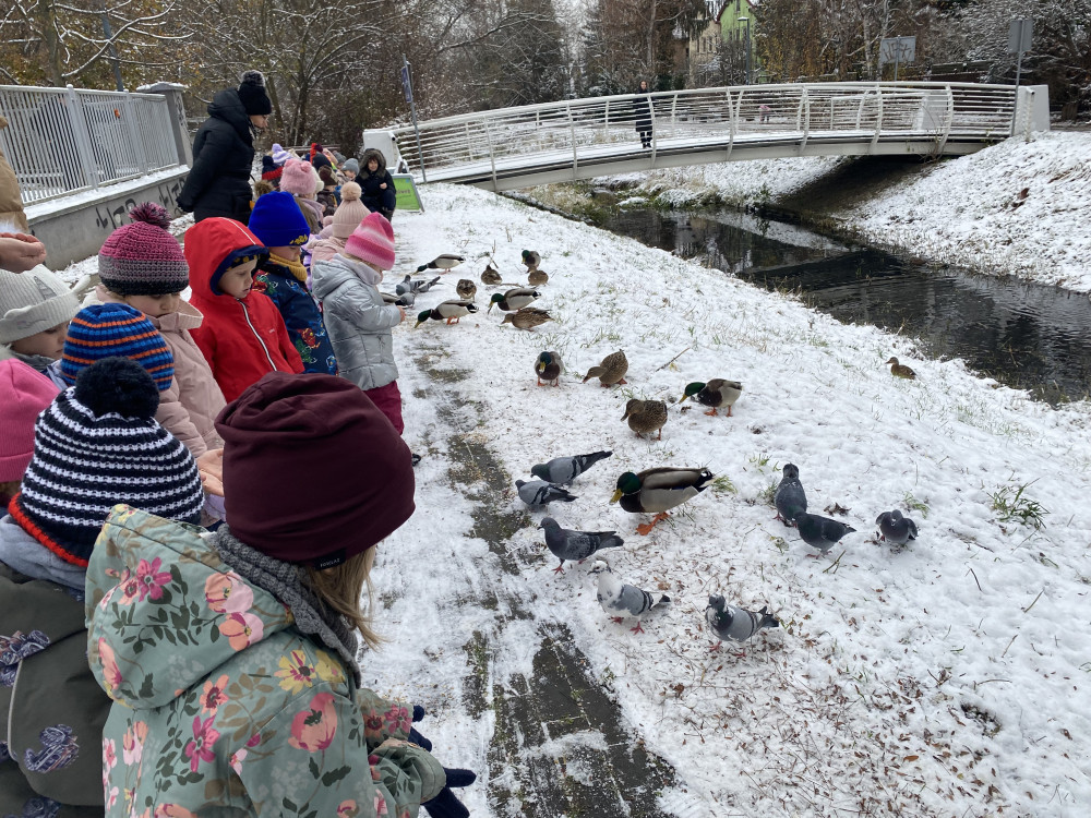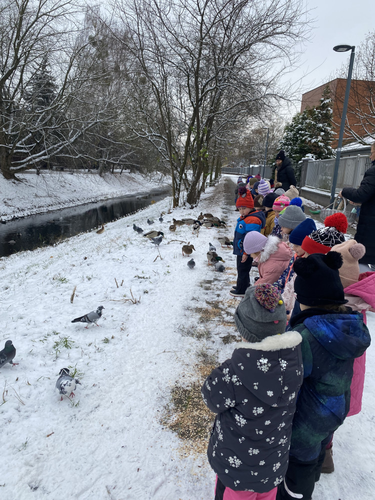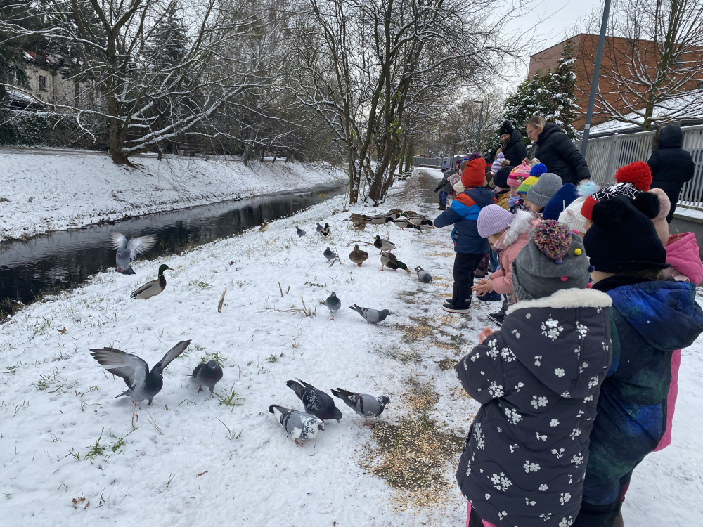 Pierwszy śnieg - pierwsze karmienie kaczek